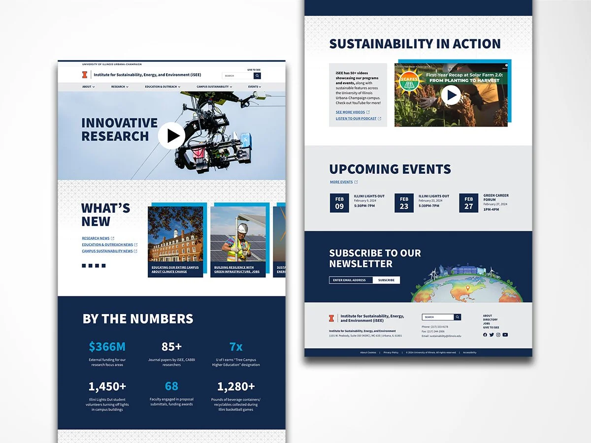 The University of Illinois Institute for Sustainability, Energy, and Environment sought assistance in organizing their information architecture for better clarity. They aimed for a bold design that highlighted key calls to action while drawing attention to underfunded programs within their department. This streamlined approach enables UI iSEE to showcase its current achievements and emphasize the programs that need support.